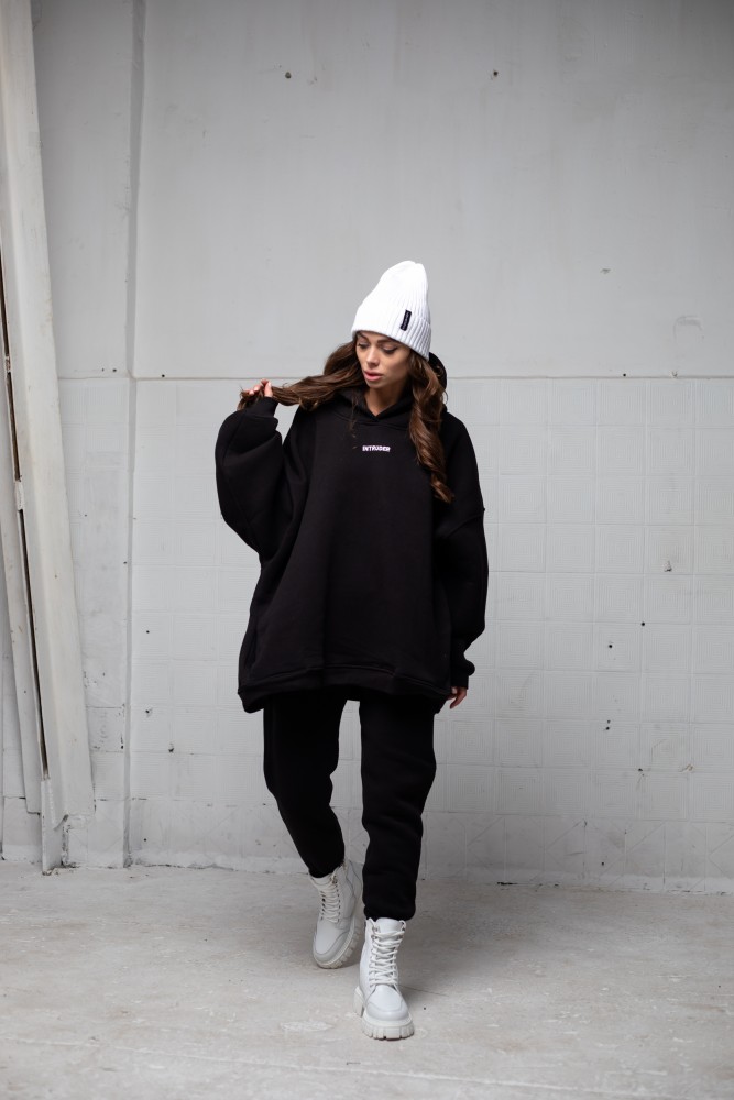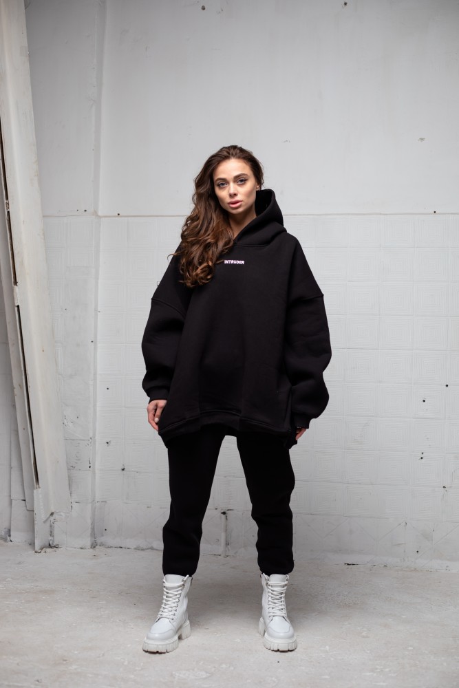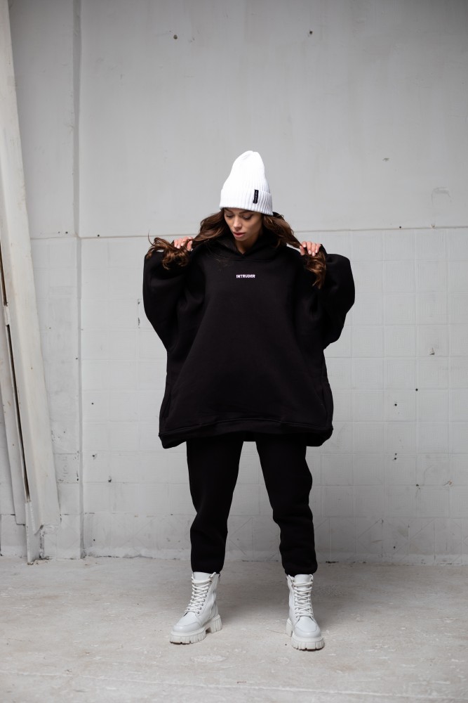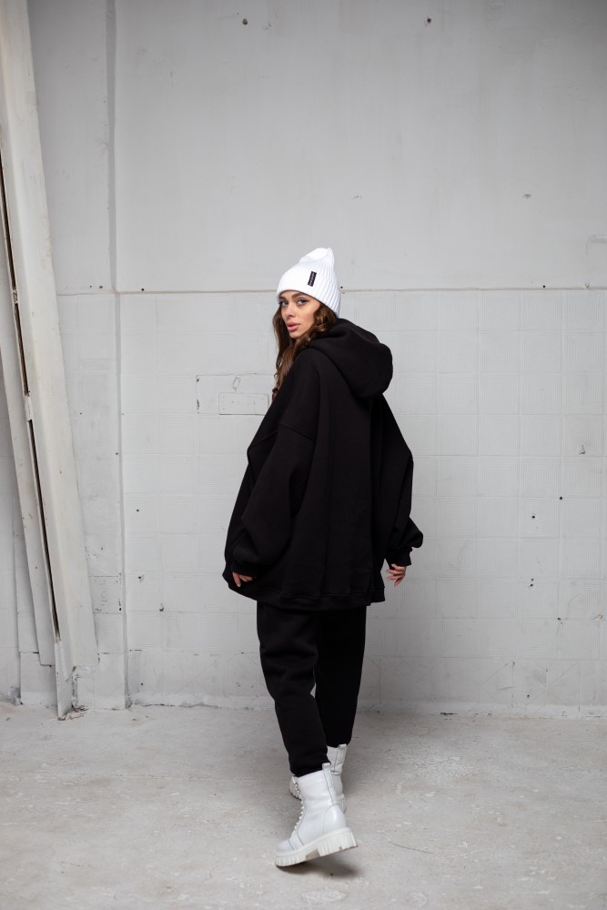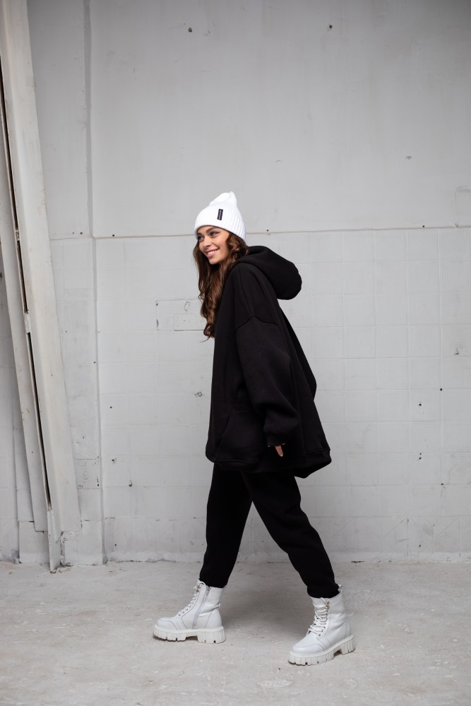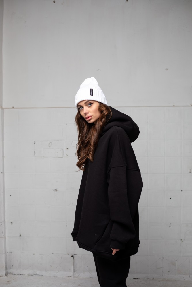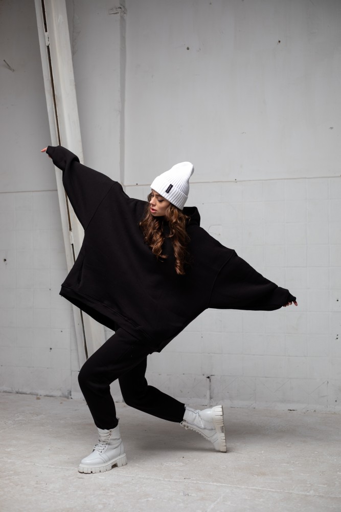 – вільна модель із заниженою лінією плеча та подвійним, глибоким каптуром;