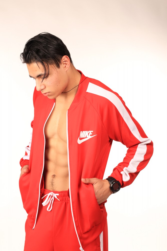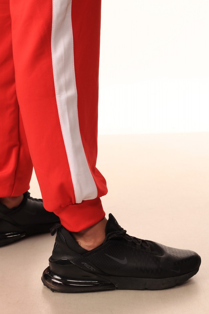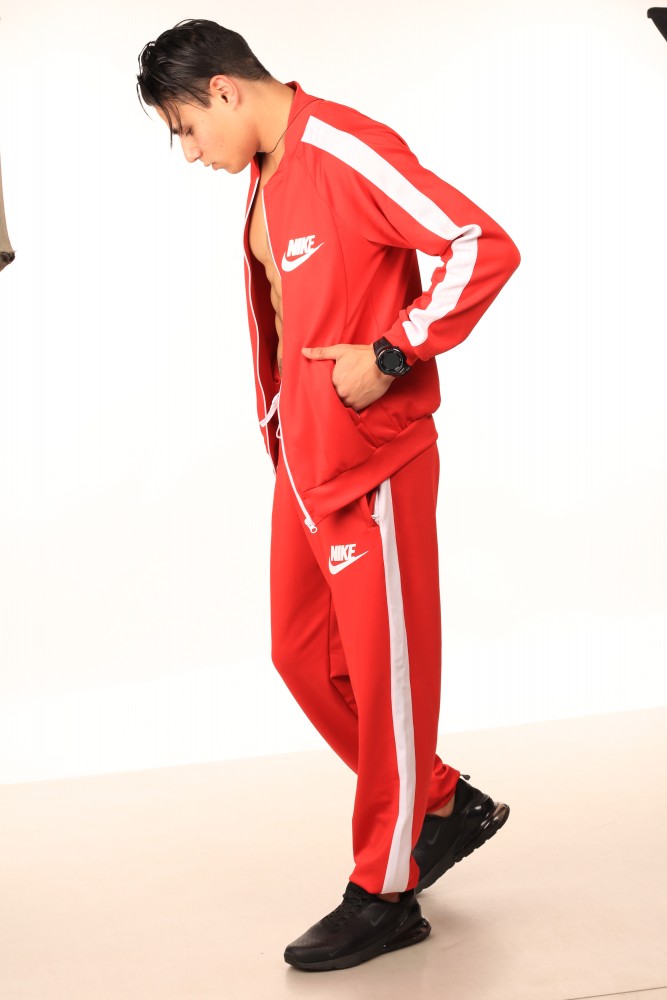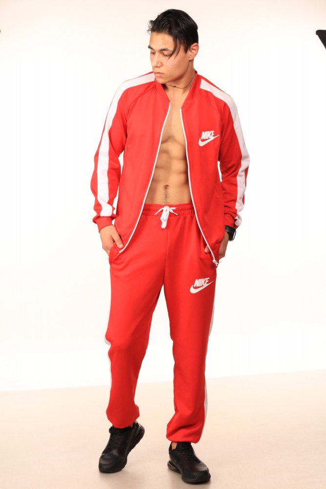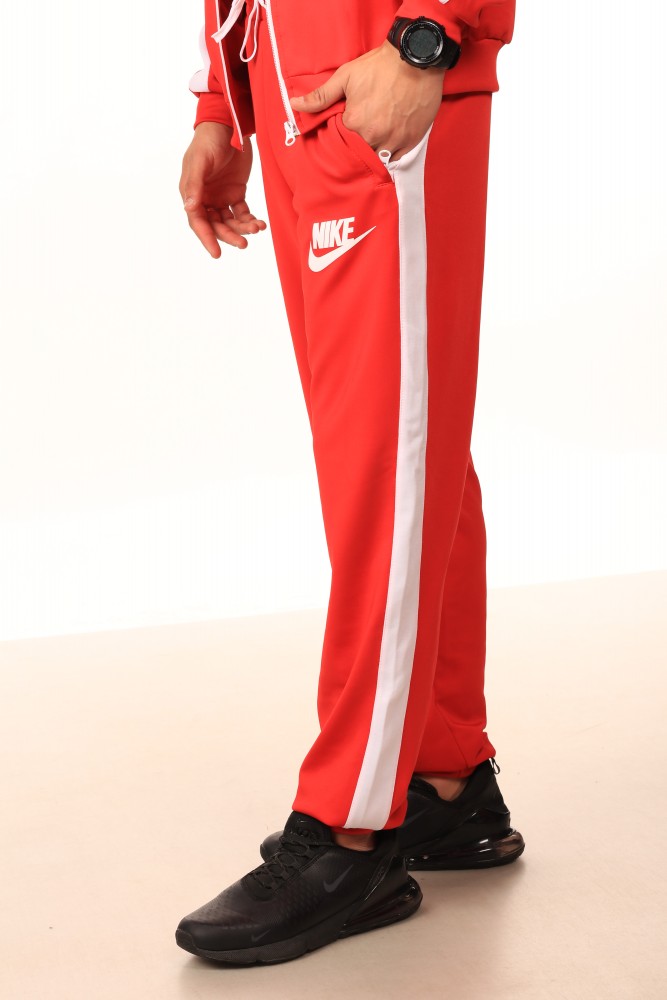 Костюм Nike красный с белыми лампасами.Штаны имеют два врезных кармана.Кофта на змейке,по бокам два кармана.
