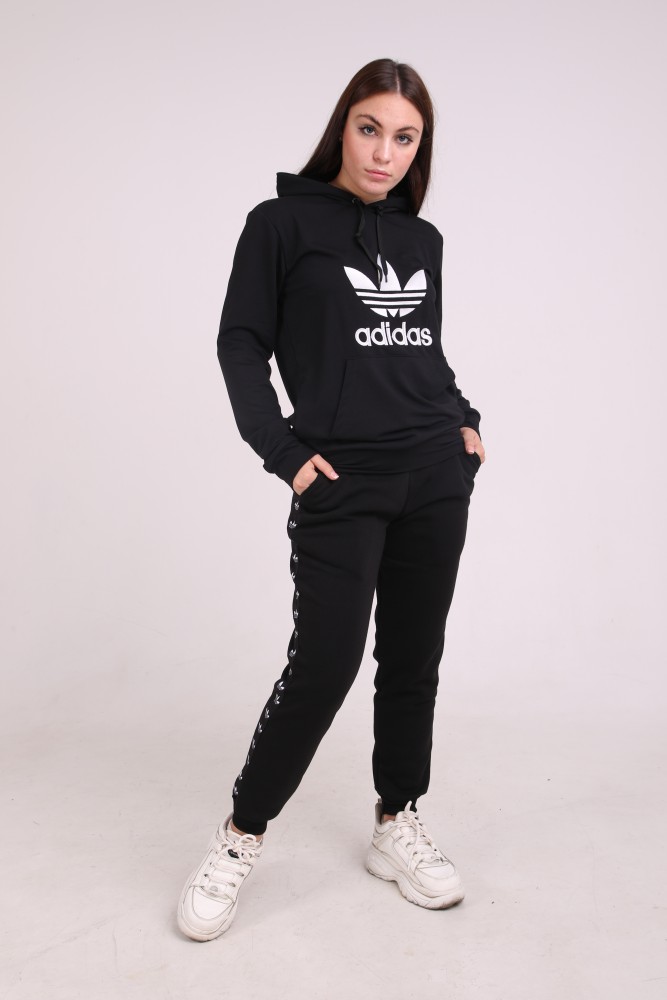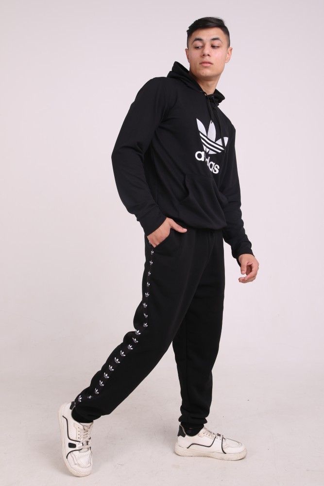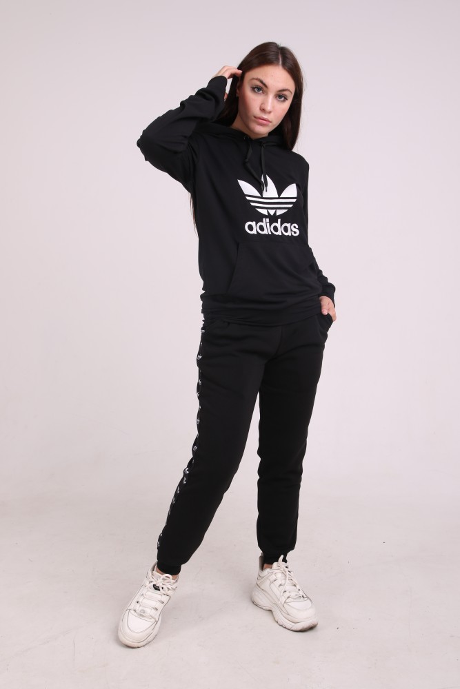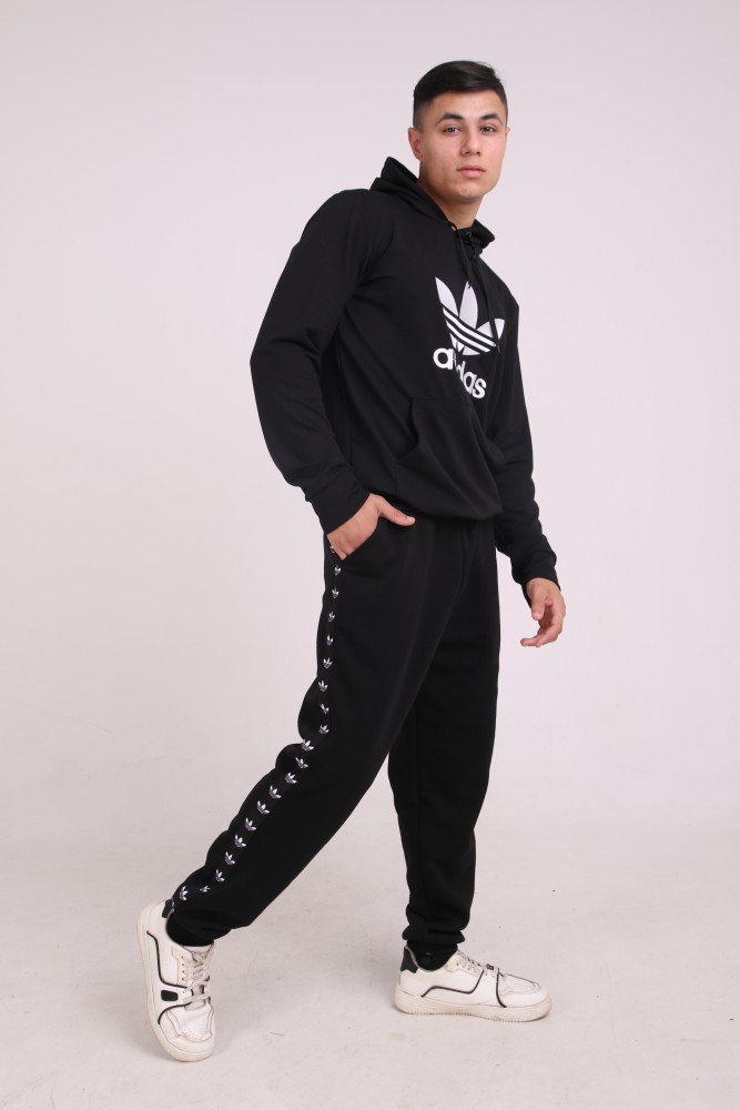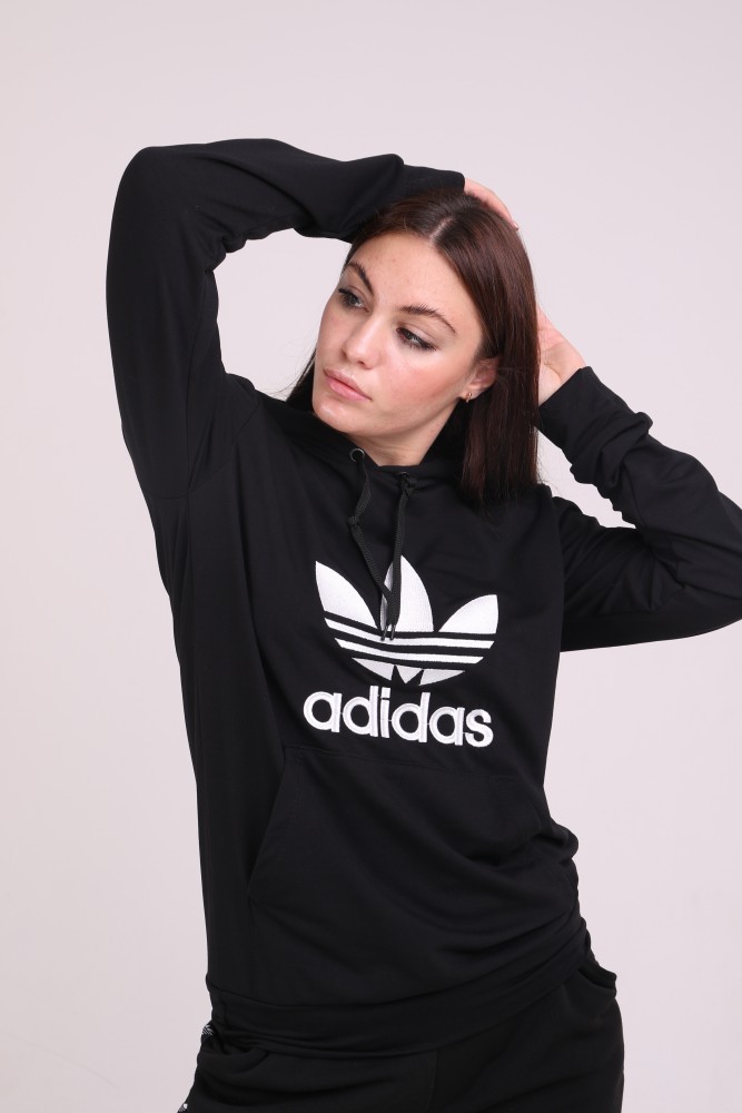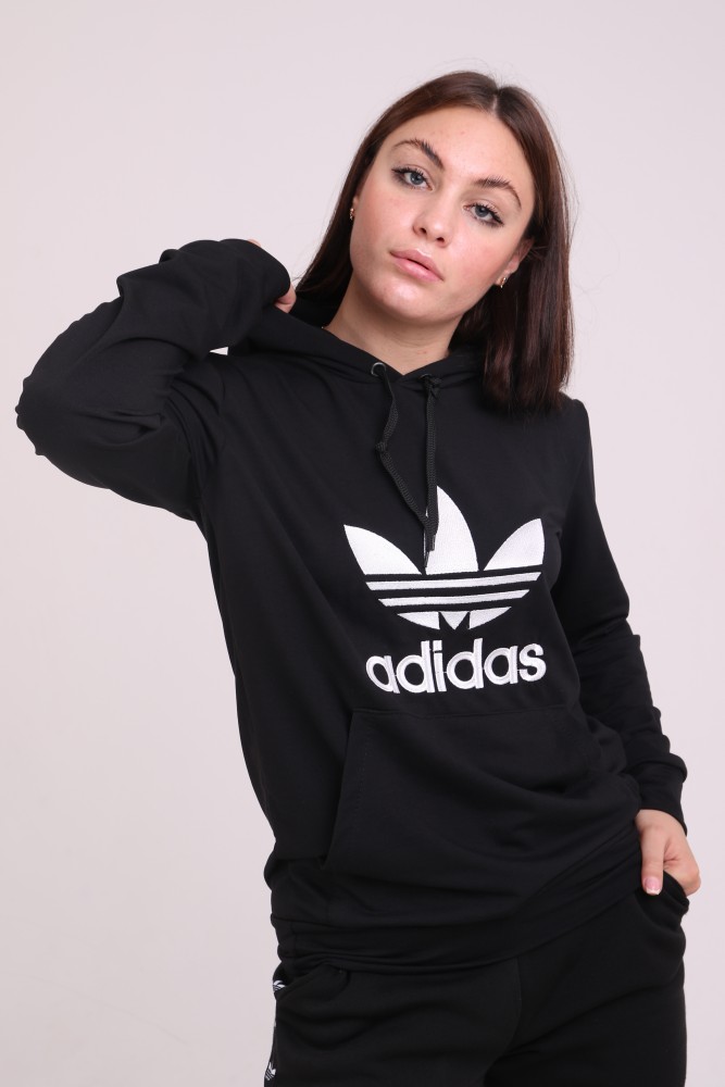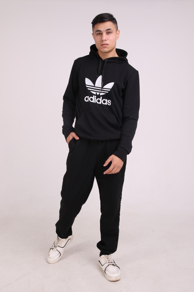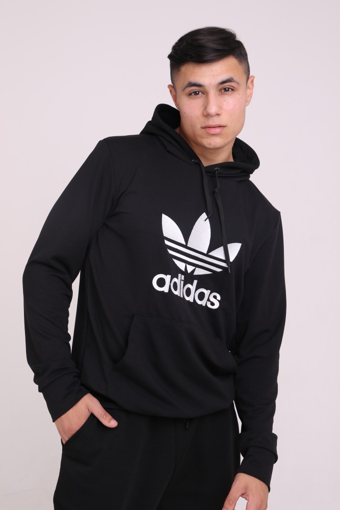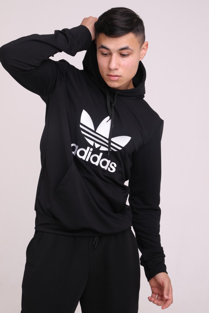 Худи чёрный с вышитым логотипом Adidas имеет двойной капюшон и карман кенгуру.